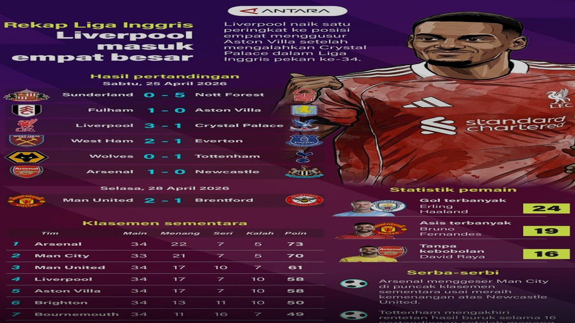 Strategi News — Empat besar Liga Inggris kini dihuni Liverpool lagi. The Reds menggeser Aston Villa dari posisi empat setelah mengandaskan Crystal Palace pada pertandingan pekan ke-34, memperebutkan tiket kompetisi Eropa musim depan yang semakin ketat persaingannya.